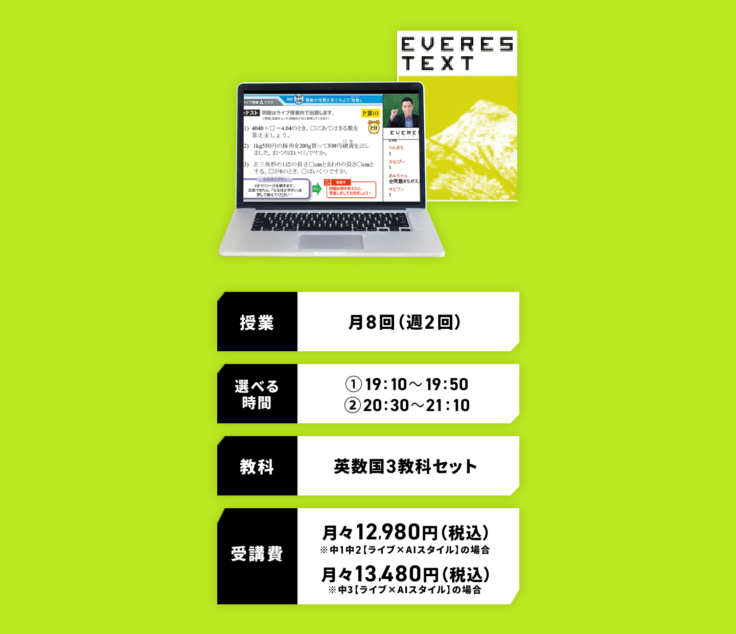 〈エベレス〉は難関高校合格を目指す生徒に向けたオンライン塾です。〈エベレス〉が追求した独自のカリキュラムで、忙しい中学生活の限られた時間の中でも、自宅から難関高校合格を目指すことができます。